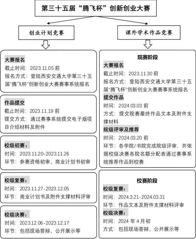为深入学习贯彻习近平新时代中国特色社会主义思想,深入贯彻落实党的二十大精神,坚持贯彻团的十九大精神,落实学校第十三次党代会精神,引导和激励学生弘扬时代精神,把握时代脉搏,通过开展广泛的社会实践、深刻的社会观察,不断增强对国情社情的了解,推动产学研融合互促,争做西迁精神新传人,为建设社会主义现代化强国、实现中华民族伟大复兴的中国梦贡献青春力量,同时为2024年在我校举办的第十四届“挑战杯”中国大学生创业计划竞赛,以及2024年“互联网+”大赛、2025年全国“挑战杯”竞赛选拔参赛作品,经科研院、研究生院、教务处、就创中心、学生处、实践教学中心、团委等单位研究,决定举办西安交通大学第三十五届“腾飞杯”创新创业大赛暨“挑战杯”国赛选拔。具体通知如下:
