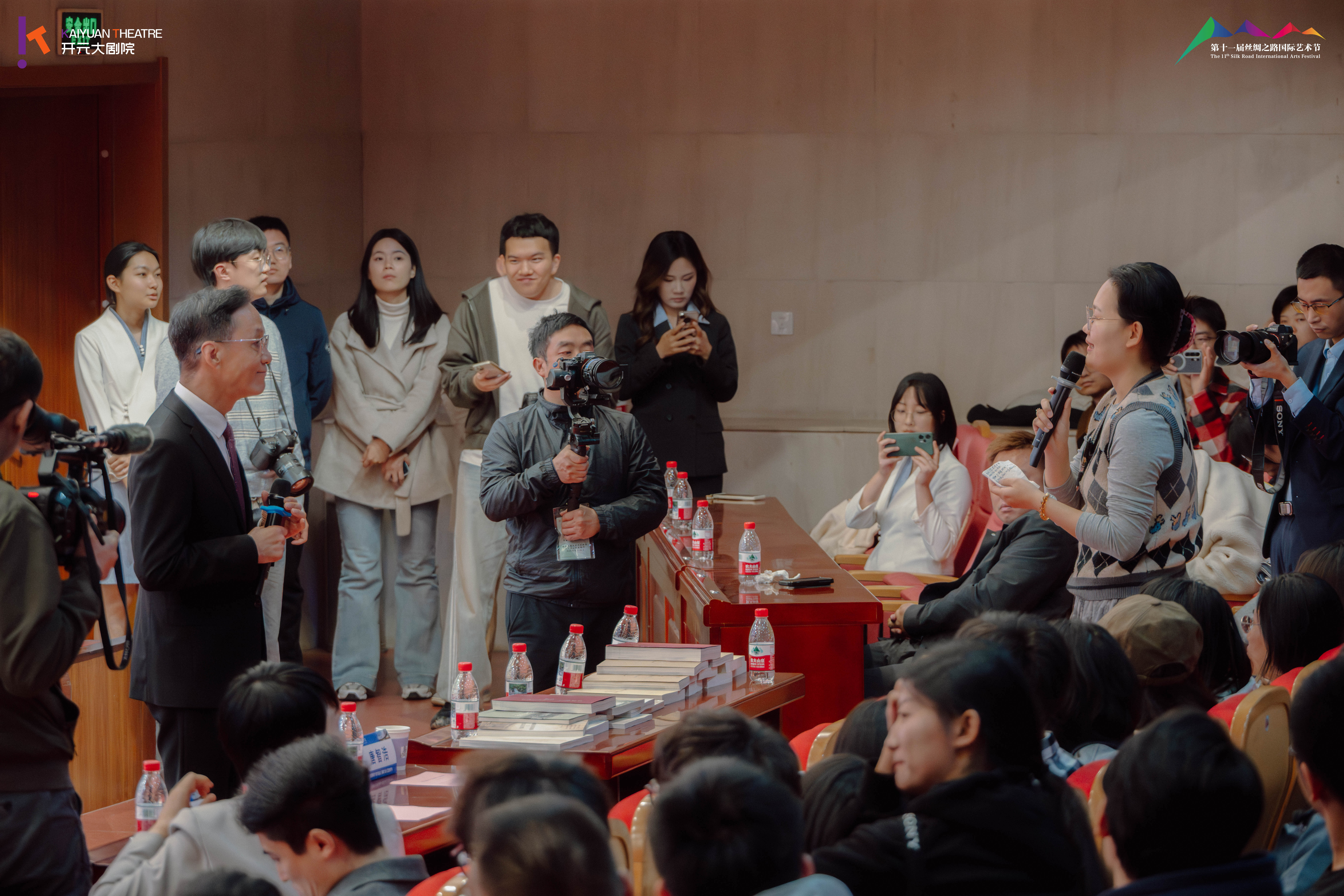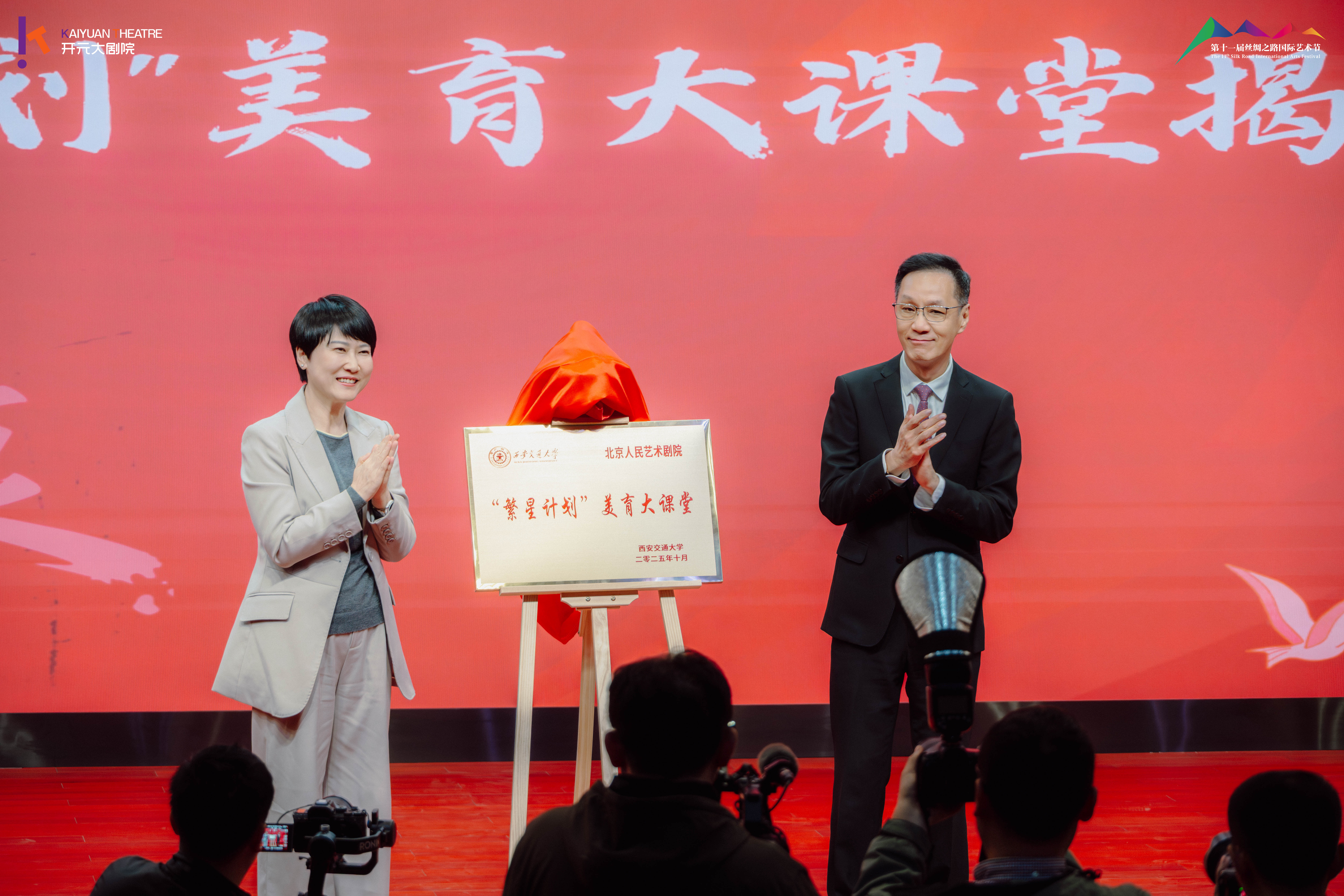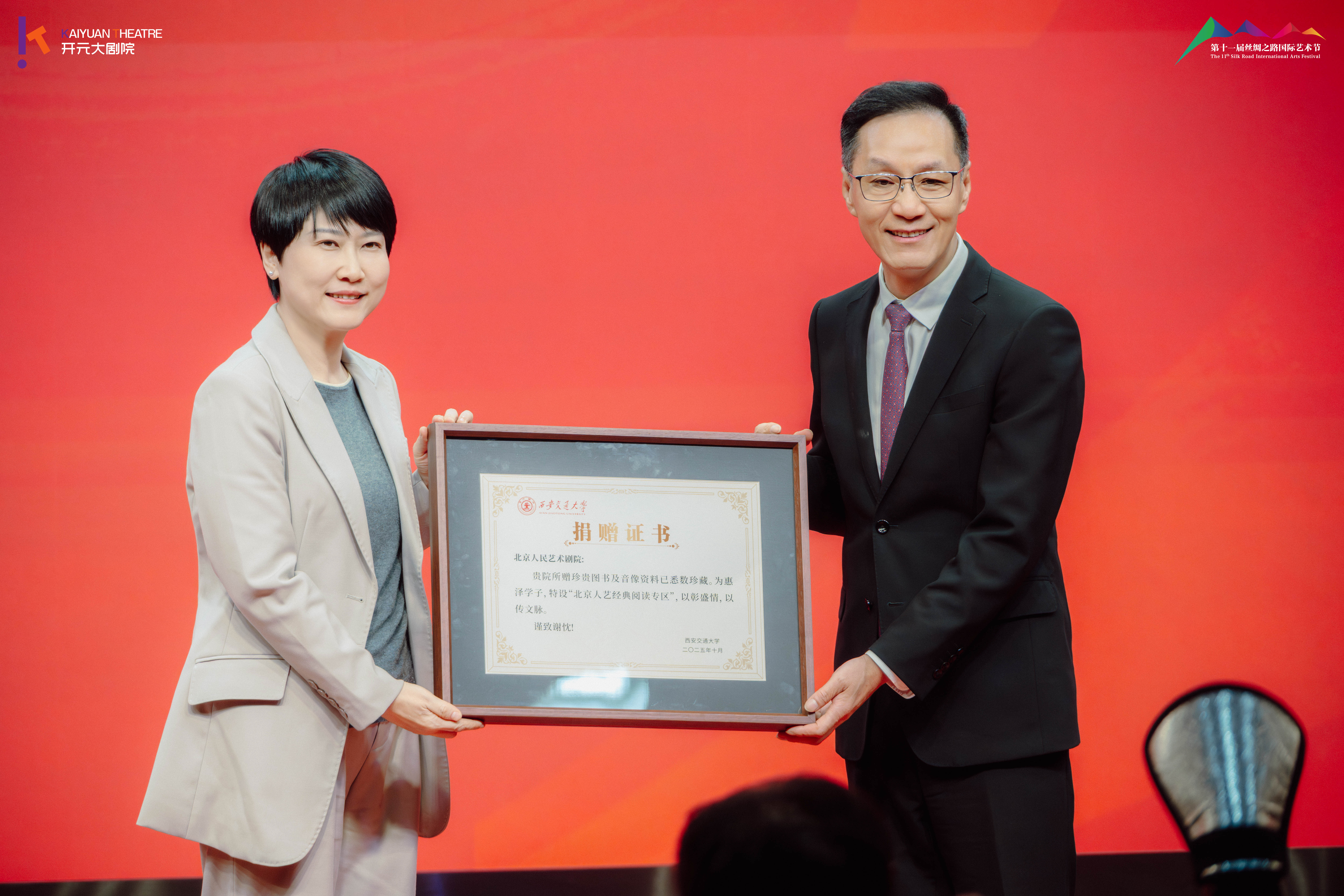 讲座前,王欢与冯远征共同为西安交通大学“繁星计划”美育大课堂揭牌。冯远征还代表剧院捐赠了人艺出版的理论书籍及刊物,王欢代表学校接受捐赠并向冯远征颁发了捐赠证书。