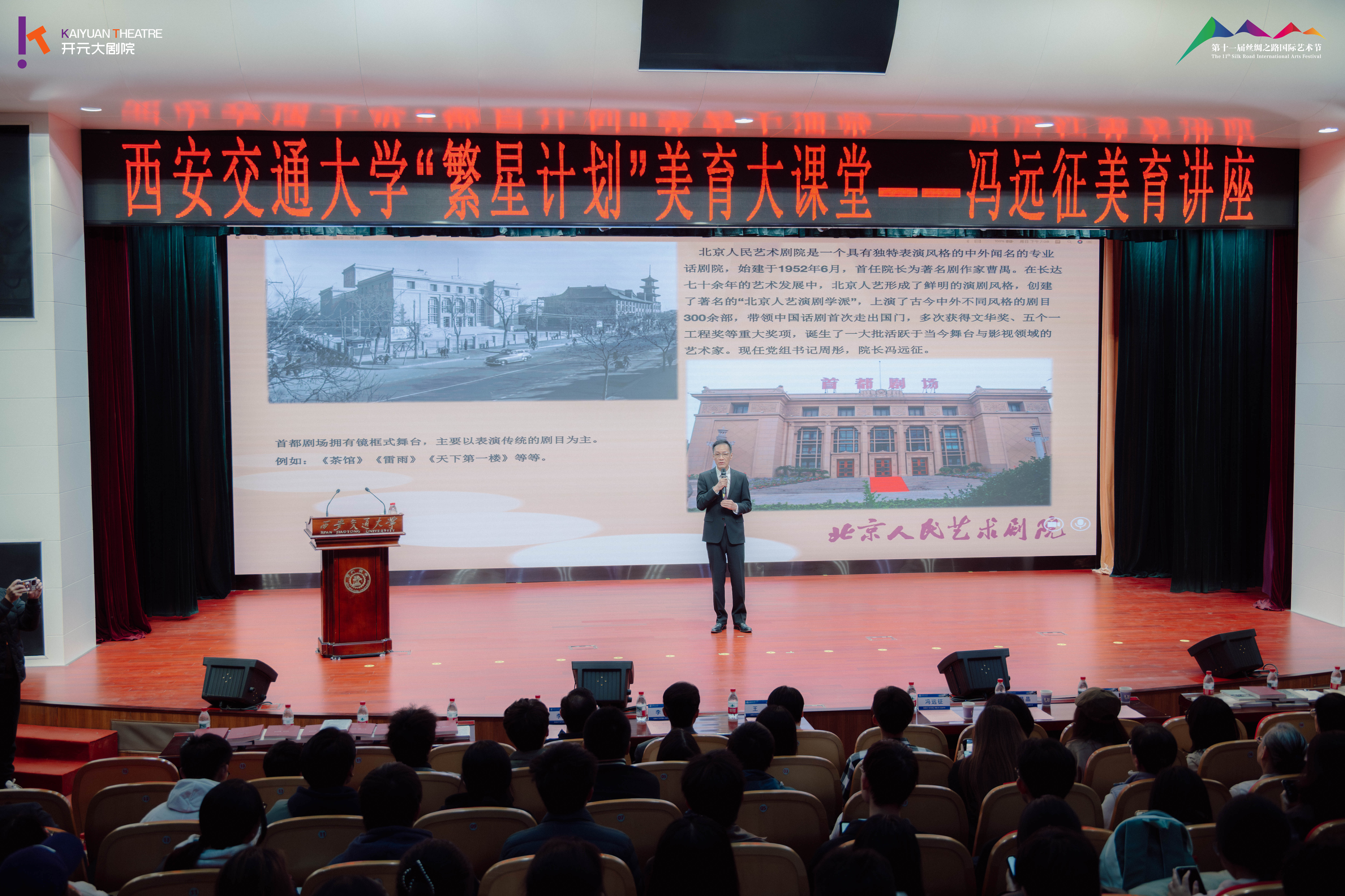 10月26日晚,西安交通大学“繁星计划”美育大讲堂(第一讲)在兴庆校区主E多功能报告厅开讲,北京人民艺术剧院院长、著名表演艺术家冯远征作报告,党委副书记王欢出席。冯远征以“青春有我,岁月有痕”为题,带来戏剧大师课,从自身多年的艺术实践出发,讲述舞台背后的故事,分享个人对戏剧表演艺术的理解,鼓励青年学子勇于表达自我、扎根生活,用戏剧语言传递时代声音,展现当代青年的青春力量。