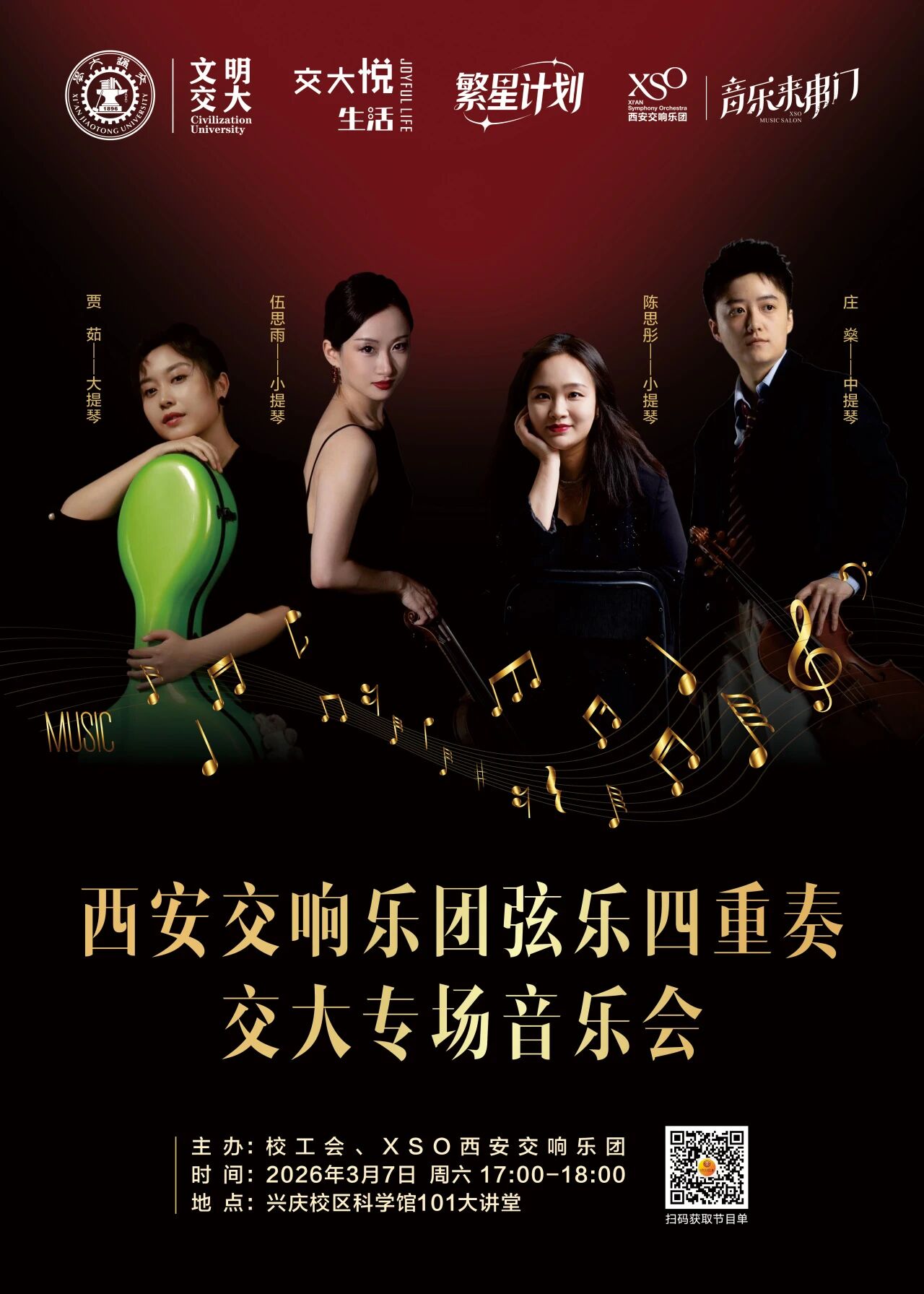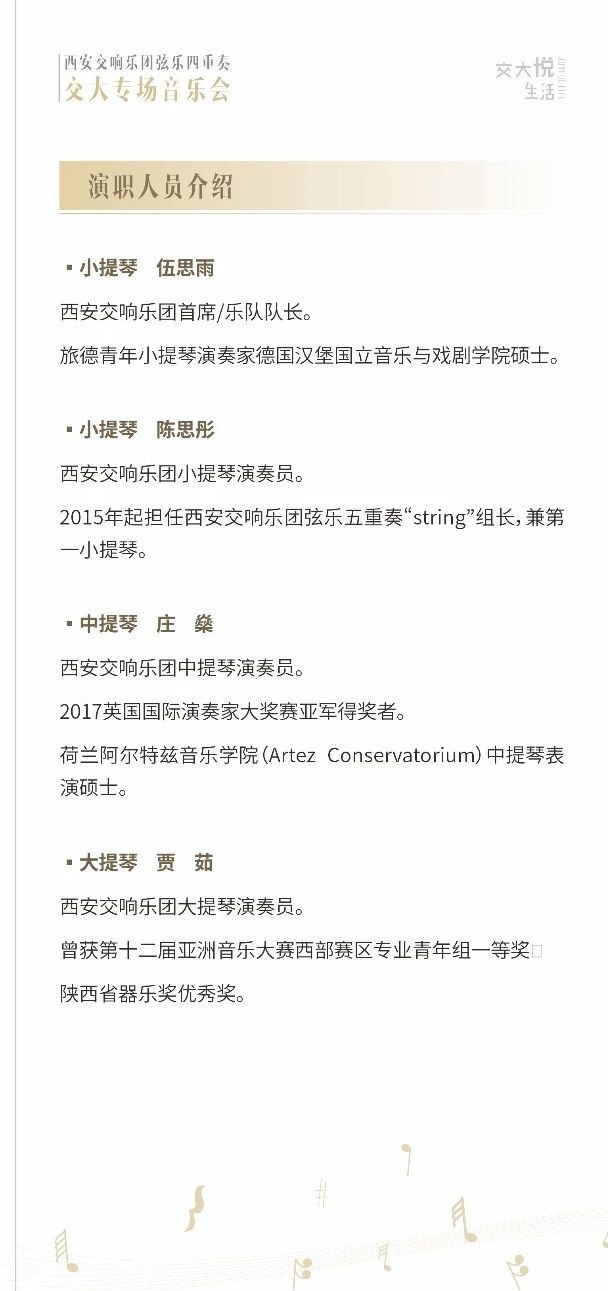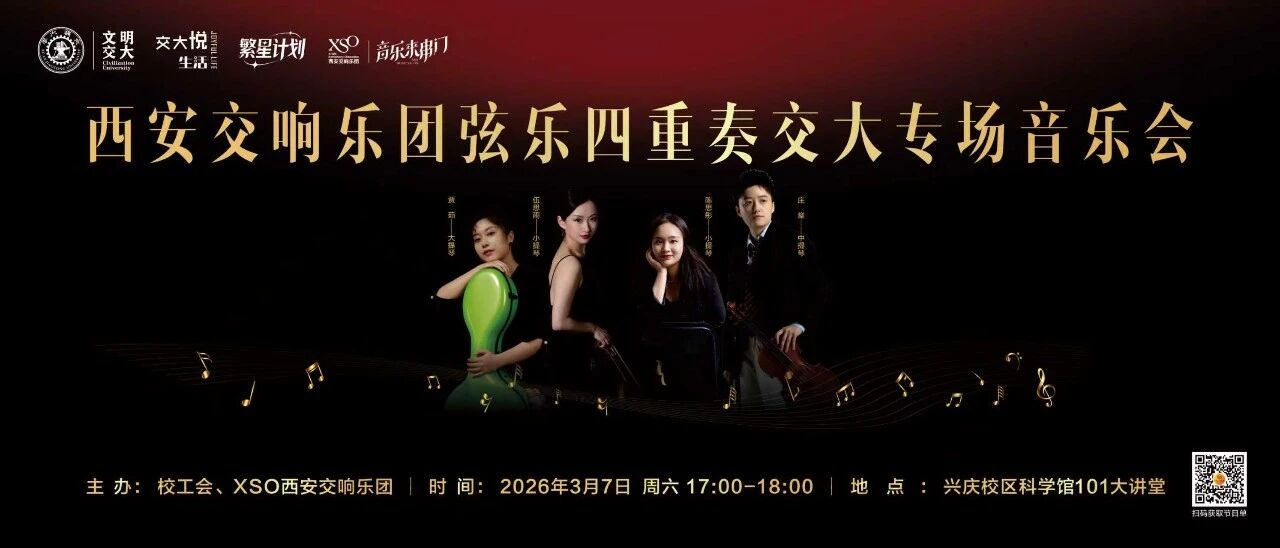 为进一步丰富师生文化生活,促进高雅艺术传播交流,XSO西安交响乐团携手西安交通大学,共同举办“西安交响乐团弦乐四重奏交大专场音乐会”活动。