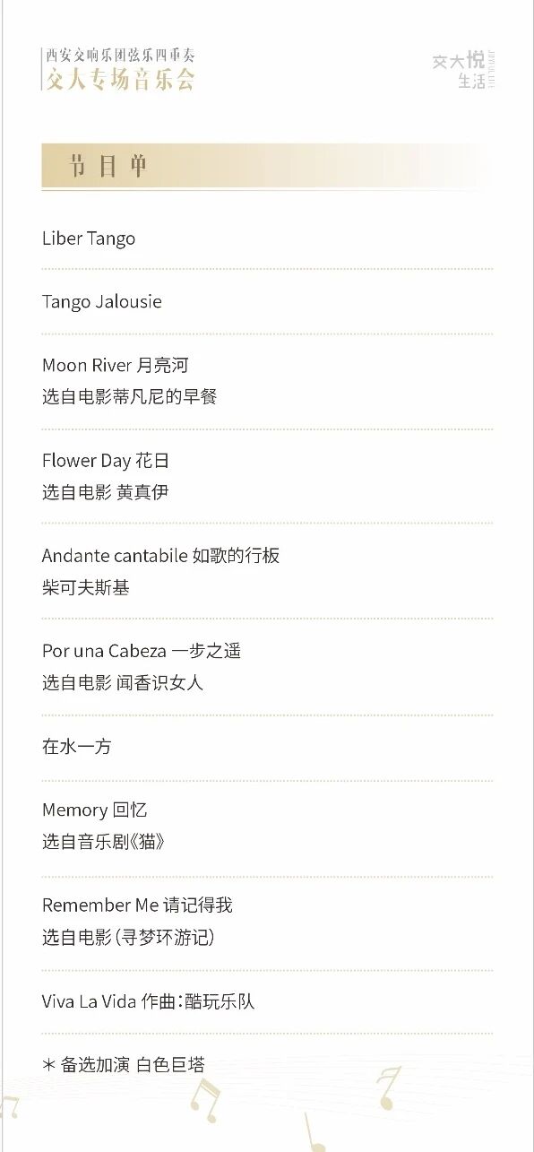 音乐会特邀西安交响乐团首席伍思雨、西安交响乐团小提琴演奏员陈思彤、西安交响乐团中提琴演奏员庄燊和西安交响乐团大提琴演奏员贾茹共同演出。演出曲目精心编排,涵盖《Moon River》《Memory》《Remember Me》《Viva La Vida》等经典作品,旨在通过交响乐的艺术形式,展现时代风貌与青春力量,营造积极向上的校园文化氛围。