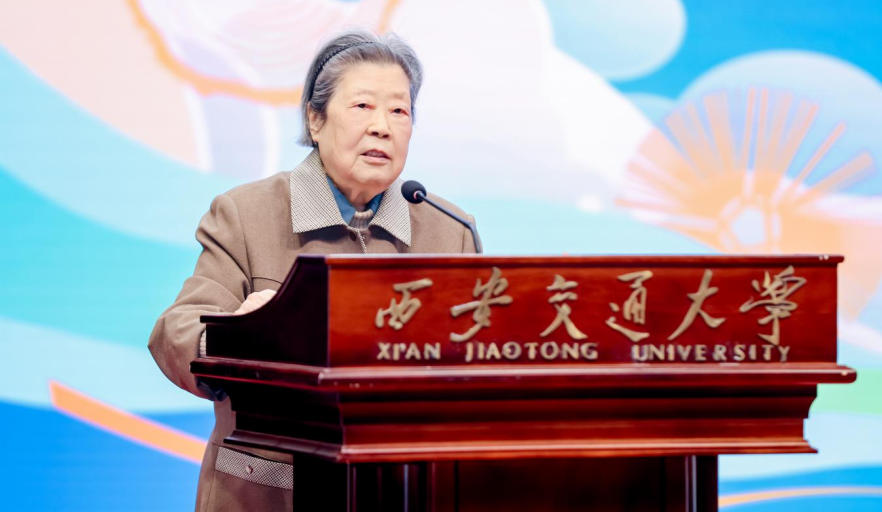 西迁老同志代表胡奈赛教授深情寄语。她亲切讲述了“130”与“70”两个数字的背后深厚的爱国主义和交大人饮水思源的优良传统。她勉励全体学子要心存感恩、成为新时代的奋斗者,在建校130周年暨西迁70周年之际,像当年的西迁人那样继续建设学校、报效祖国。现场,王欢和志愿者代表向胡奈赛教授献花致敬,胡奈赛教授谦称自己当年是“最小西迁者”,这束花应献给已故的材料学院周惠久老先生等西迁先辈。现场师生无不动容,这不仅是对先贤的告慰,更是两代交大人之间最深沉的致敬。