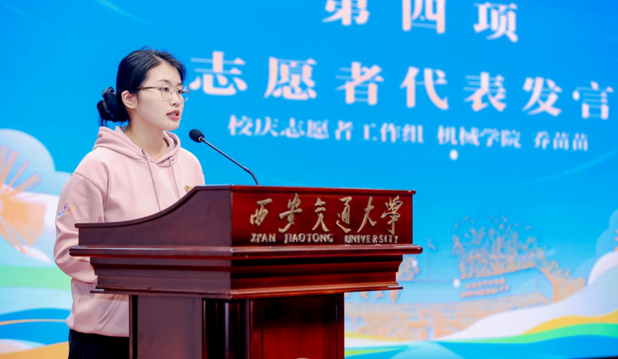 志愿者工作负责教师代表、彭康书院杨玉垚,志愿者代表机械学院硕士研究生乔苗苗分别发言。杨玉垚向志愿者们表达了期待与祝福,希望大家以严谨的态度、务实的作风投入志愿服务,在实践中成长,在奉献中闪光,展现交大学子的良好风貌;乔苗苗结合自己七年的交大志愿经历,向全体志愿者发出倡议,呼吁大家以青春之名同赴百卅荣光,用实干与担当为母校华诞增色,做西迁精神最坚定的传承者与践行者。