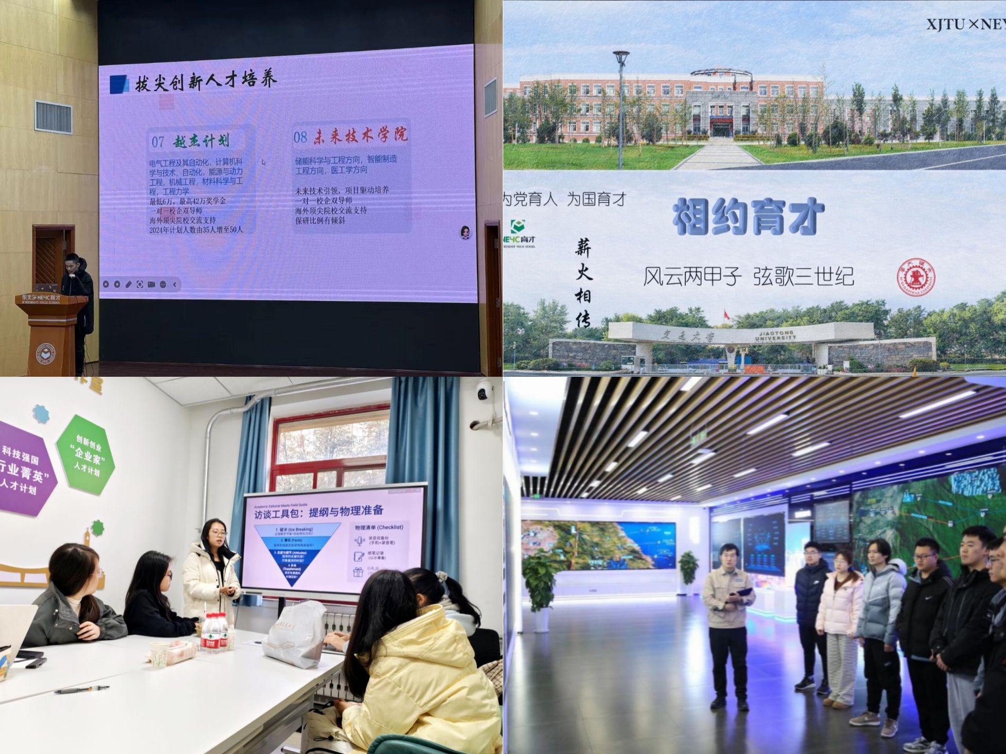 在人才输送的源头端,东北育才学校校园大使团队创建招生咨询群实现常态化答疑,注册运营“育见仙交”微信公众号,并在母校三学部同步进行系统性视觉宣发,有效搭建起大学与中学之间的人才培养桥梁。在人才成长的培育端,陕西省青年科技人才成长规律调研小队聚焦“十大学术新人”与科技新星群体,深入高校、院所与企业采撷科研故事,通过调研报告传递榜样精神,并向相关部门提交优化培育建议。在人才报国的实践端,“电燃梦想”实践团赴国网南瑞联合培养基地,走进科技成果展示区、探访工作平台、开展就业座谈,在对话中明晰投身国家重点行业建设的方向。