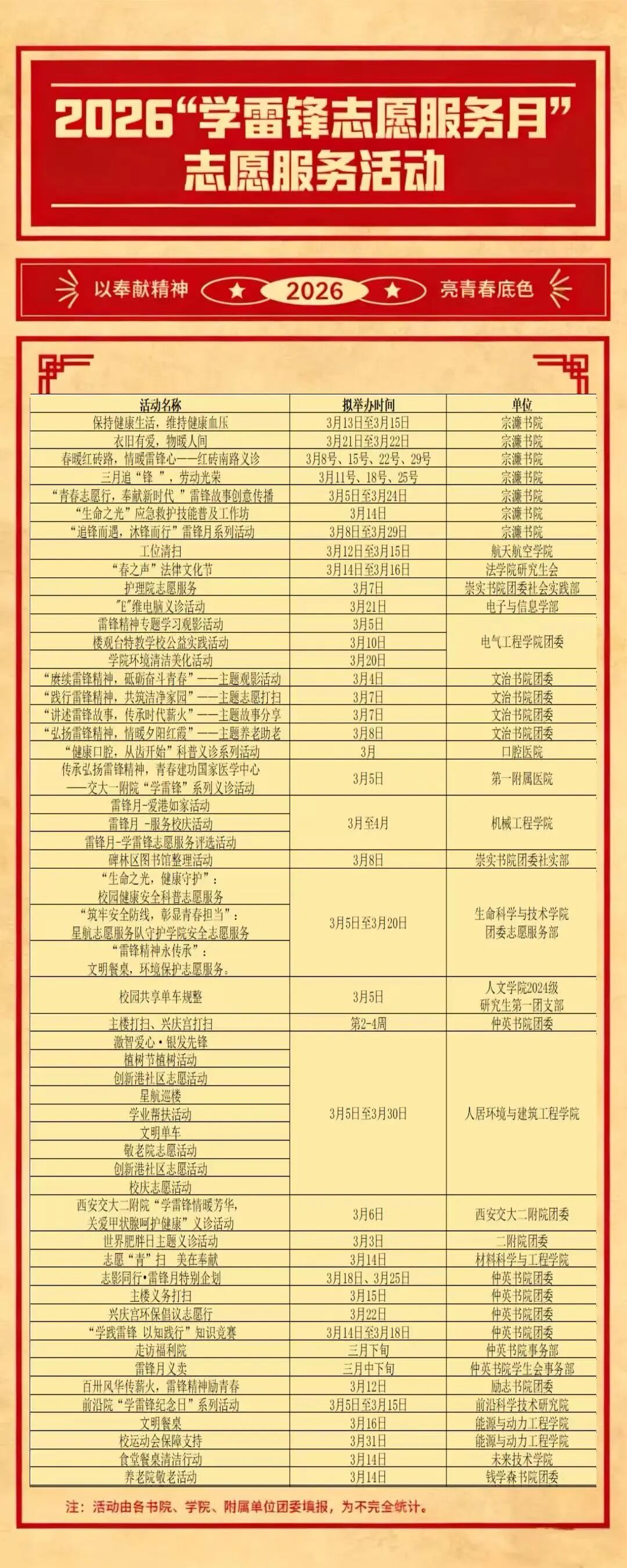 各书院、学院(部、中心)及附属单位团组织精心筹备、积极组织,交大青年怀揣“奉献、友爱、互助、进步”的志愿精神,将雷锋精神与西迁精神深度相融,以实干奔赴志愿之约。校园里的暖心服务、社区中的温情帮扶、街头巷尾的文明践行,交大青年正用一举一动,让志愿之花绽满春日校园,也将温暖传递到更多角落。这份2026学雷锋志愿服务月活动速览,快来解锁!