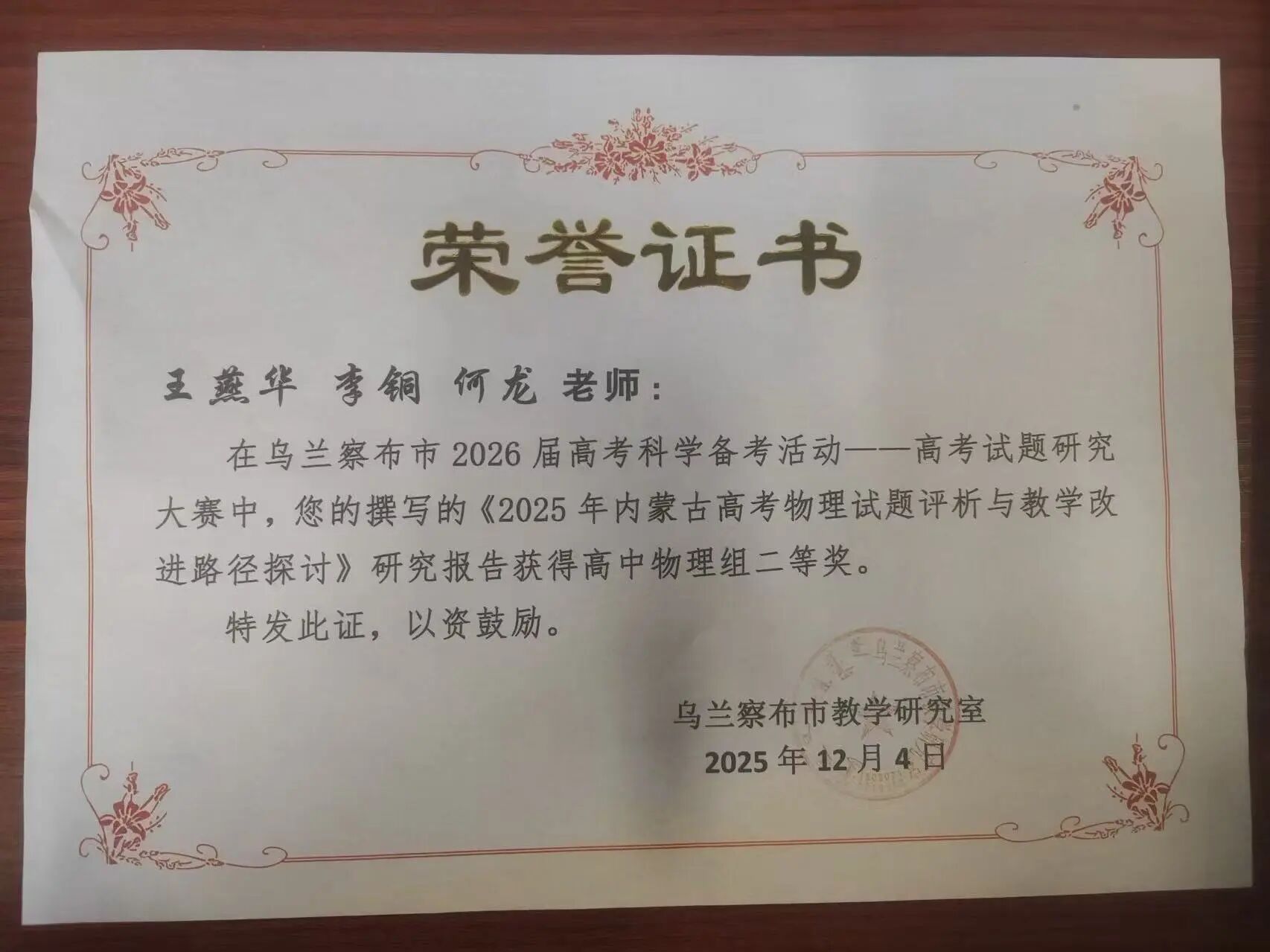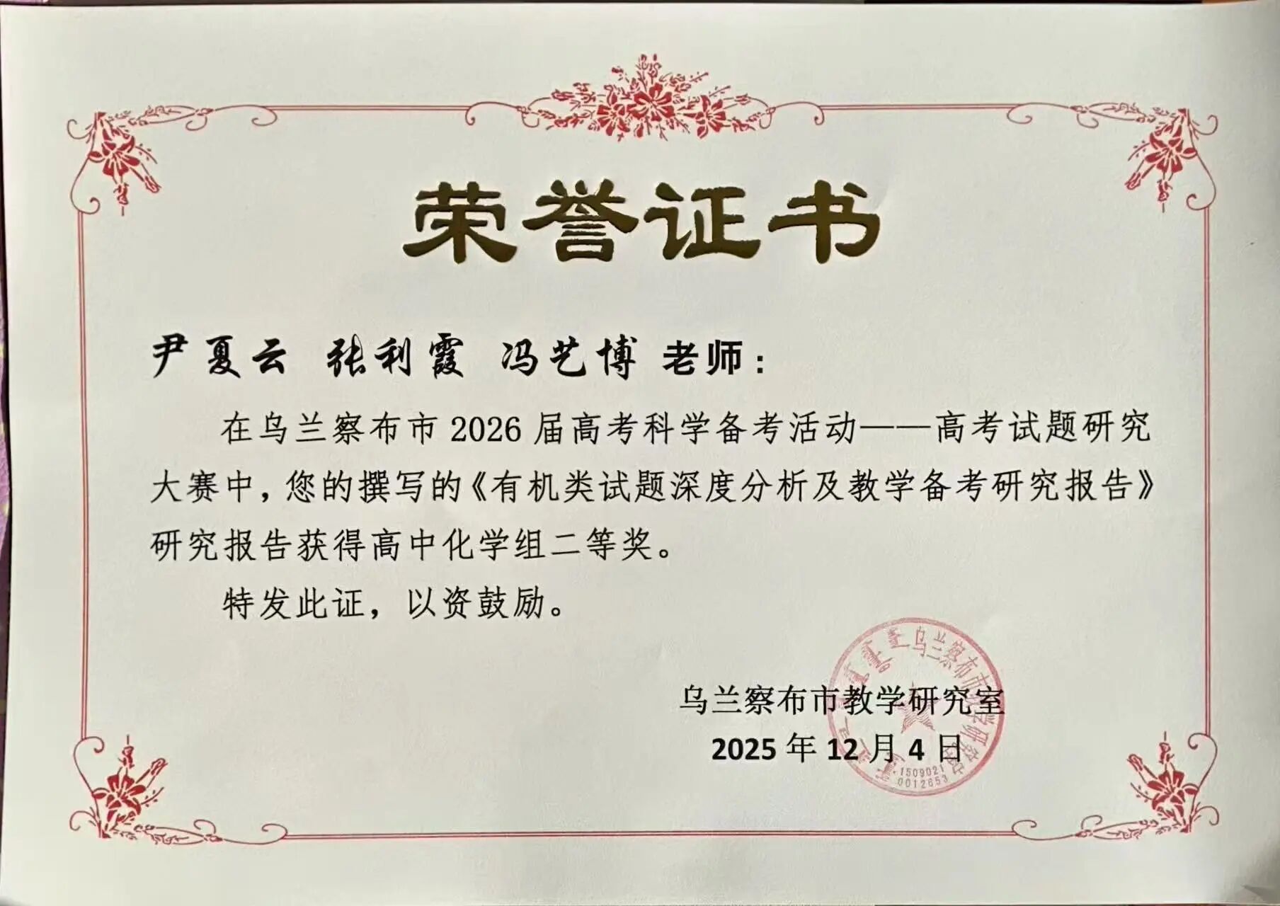 很荣幸在乌兰察布市 2026 高考试题研究大赛中获奖。作为研究生支教团成员,这份荣誉是认可,更是鞭策。